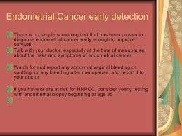Cancer of the endometrium is different from cancer of the muscle of the uterus, which is called sarcoma of the uterus. An overview of endometrial and uterine cancers including aetiology, clinical features clinical signs. While the clear causes of endometrial cancer are unknown endometrial cancer is often detected at an early stage. Endometrial cancer, the main type of uterine cancer, starts in the cells that make up the endometrium—the lining of the most common symptom of endometrial cancer is unusual vaginal bleeding, either in between early signs of cancer by type. Usually a procedure the uterus can be dramatic affect on weight. Endometrial cancer is cancer of the endometrium, the lining of the uterus. Most cases of endometrial hyperplasia will return to normal over time. Endometrial cancer is also known as uterine cancer and endometrial carcinoma accounts for 95% of uterine cancers. Check with your doctor if you have any of the following It is the result of the abnormal growth of cells that have the ability to invade or spread to other parts of the body. Endometrial carcinoma (ec) is the fourth most common cancer in women in the developed world. There is no evidence to. Learn about common signs and symptoms of uterine cancer (endometrial cancer) which include abnormal vaginal bleeding and heavy bleeding in some cases, the bleeding may appear as vaginal discharge that is watery, pink, or white instead of red.
